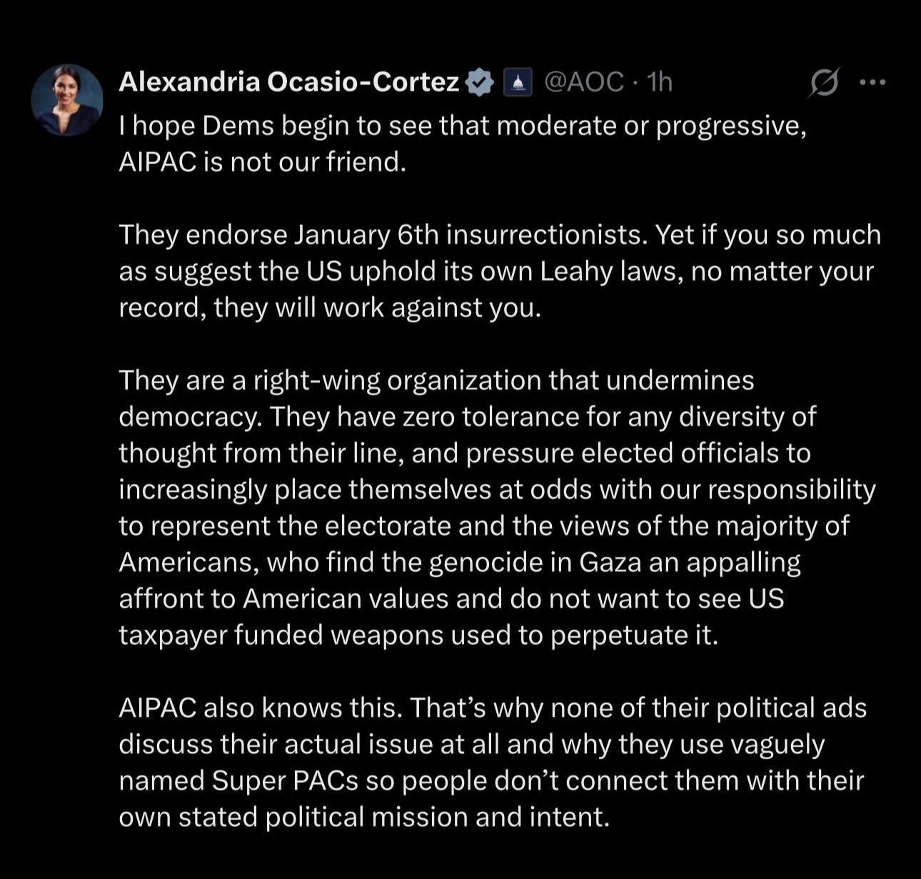 AIPAC seems to have kept their hold on everyone else though, as Hakeem Jeffries refused to answer whether or not he would stop taking their money, despite the fact that they are consistently spending money against Democrats in congressional races. AOC said it best — AIPAC is not Democrats’ friend.