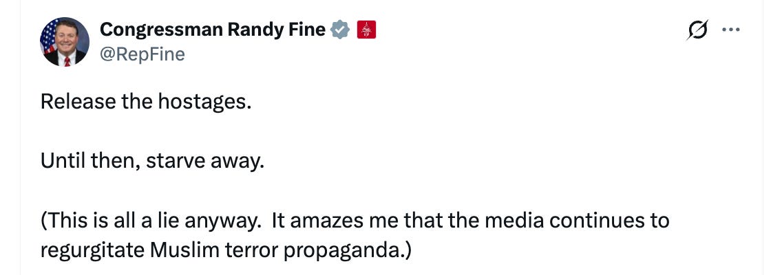I hope Democrats grow a spine and stop taking AIPAC money, and I hope Randy Fine resigns or is removed. He is not fit to be a Member of Congress — he’s barely even fit to be a functioning member of society, given the level of hate he spews on a regular basis.