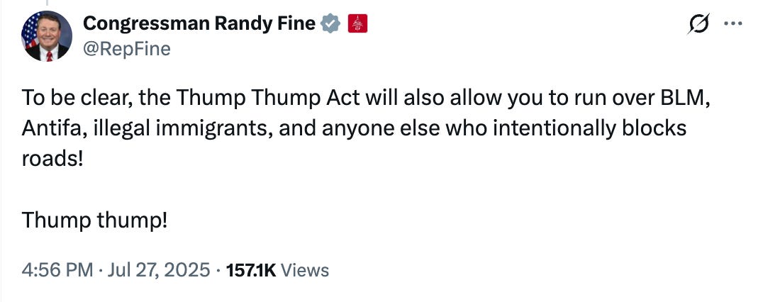 This is the same congressman that advocated for legislation that would allow people to run over those they disagree with with no consequences.