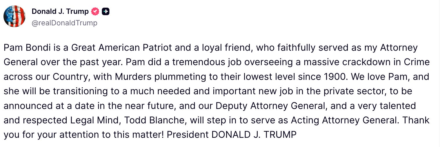 “Pam Bondi is a Great American Patriot and a loyal friend, who faithfully served as my Attorney General over the past year,” Trump wrote on Truth Social.