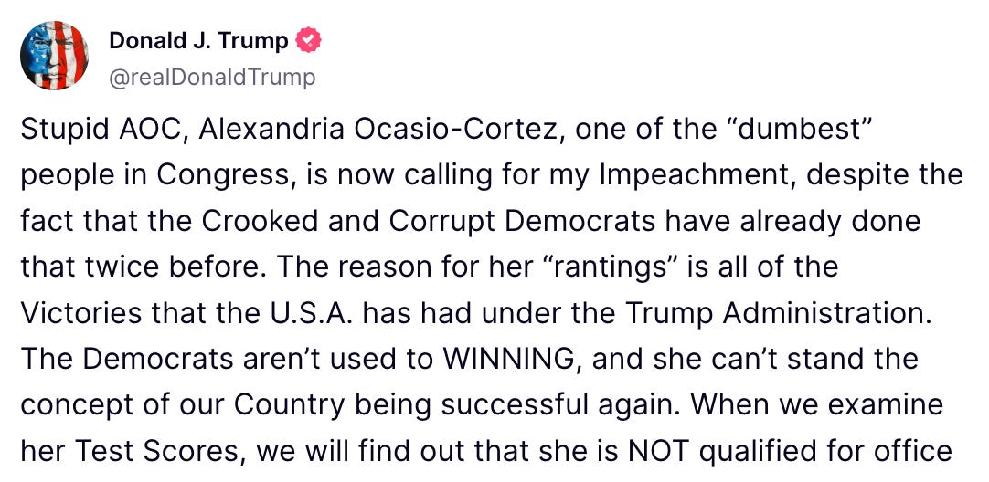 While on Air Force One on his way to a NATO summit, Trump was apparently writing a semi-incomprehensible novel online about AOC, calling her “one of the dumbest people in Congress” – sending stray shots at Ilhan Omar and Jasmine Crockett too. Trump even managed to bring up her test scores for some reason – this coming from the man who paid someone else to take his SAT for him. Every accusation is a confession, indeed.