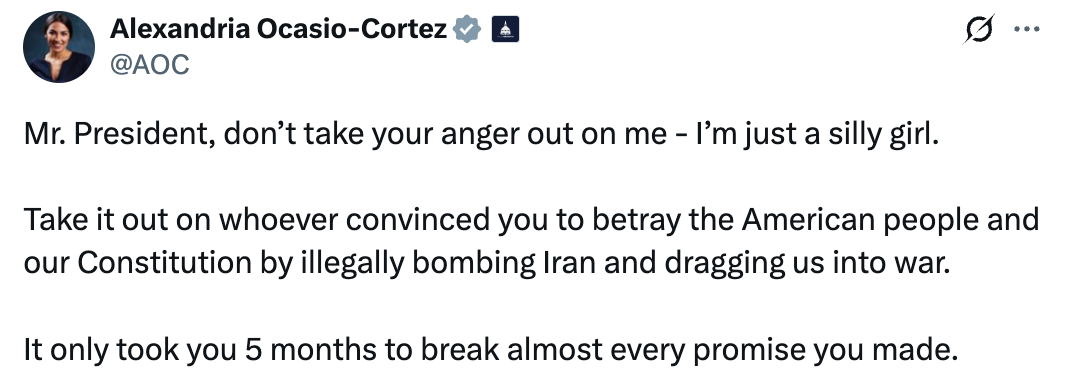 AOC responded today by doubling down on the unconstitutionality of Trump’s attack on Iran, saying, “It only took you 5 months to break almost every promise you made.”